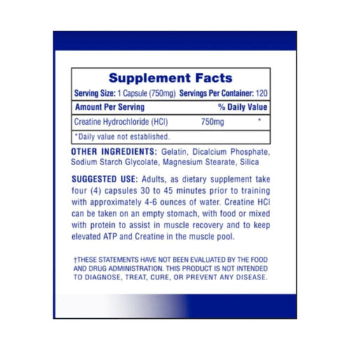 Take 4 capsules 30-40 minutes prior to training with a glass of water. Creatine HCL may be taken on an empty stomach or with food. Take with promote to enhance recovery and sleep.